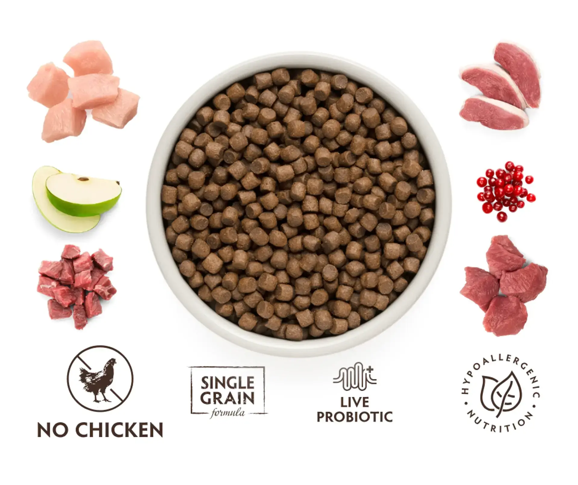 Hipoalergiczna: Brak zbóż, glutenu, kukurydzy, soi, jaj oraz tłuszczu z kurczaka.