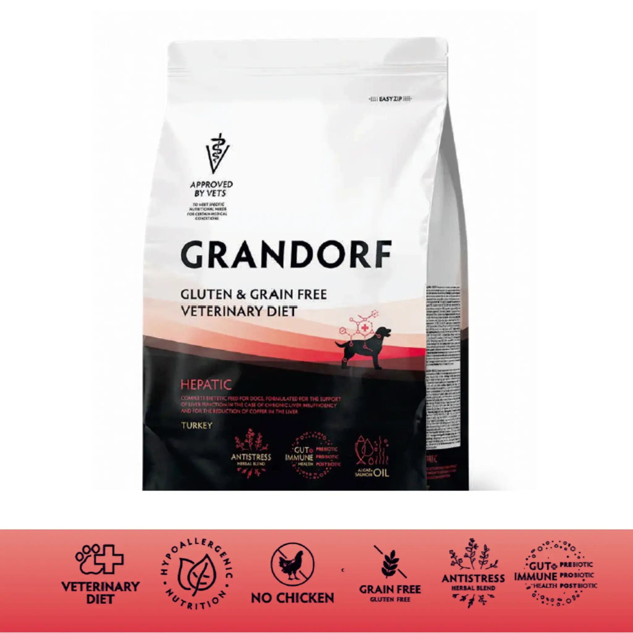 Grandorf Dog Vet Hepatic Turkey to specjalistyczna sucha karma dla psów, opracowana z myślą o zwierzętach z niewydolnością lub przewlekłymi chorobami wątroby oraz z zaburzeniami metabolizmu miedzi.