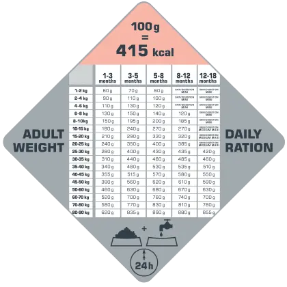 - Optymalna ilość minerałów i podstawowych aminokwasów zapewnia wzrost szczenięcia zgodny z idealną krzywą wzrostu.