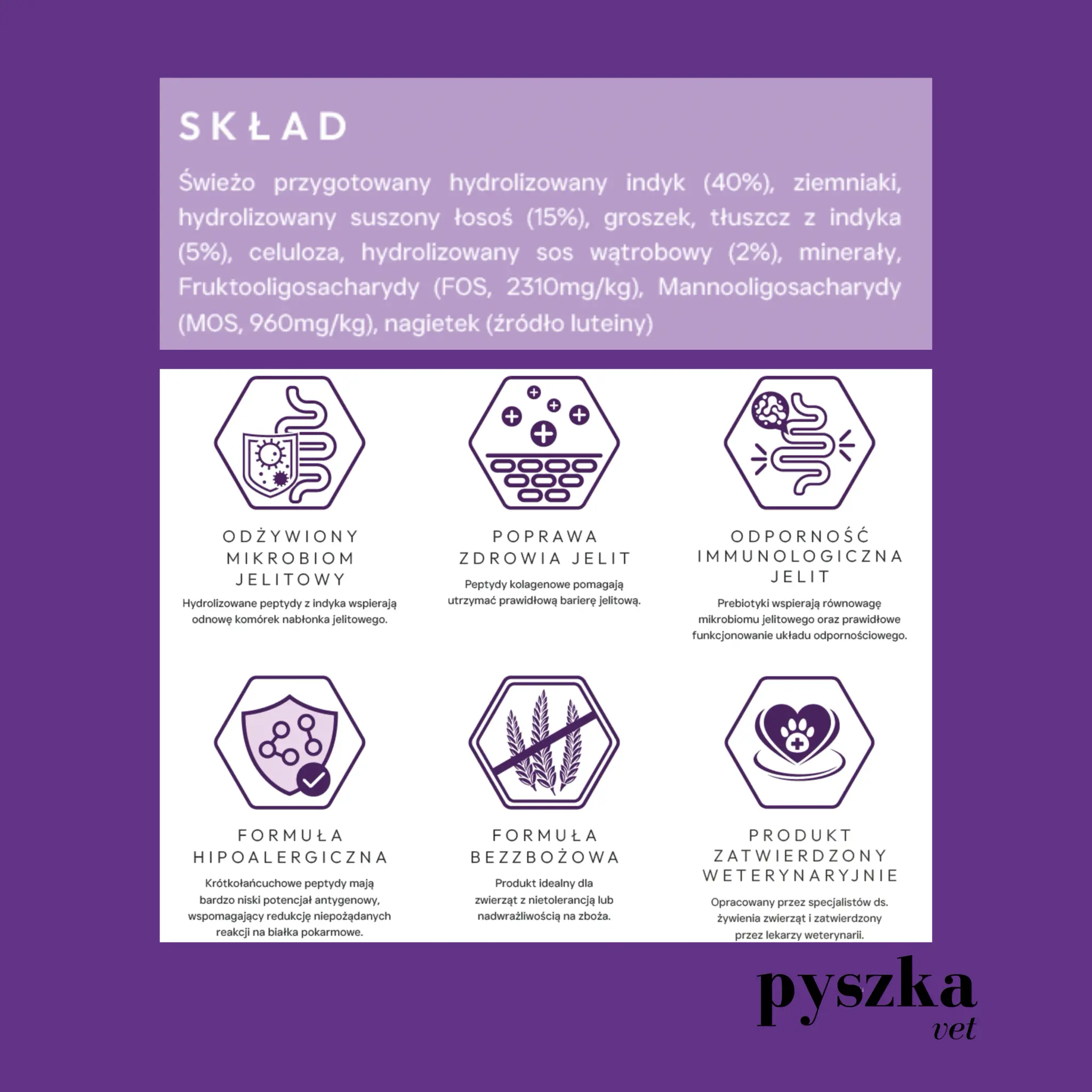 2. Co oznacza „Moc Peptydów” i dlaczego jest ważna przy problemach z trawieniem?Większość karm zawiera całe łańcuchy białkowe, które układ pokarmowy musi dopiero rozbić. W Pyszka Vet Gastrointestinal białko jest już wstępnie „pocięte” na małe peptydy (proces hydrolizy). Dzięki temu organizm kota nie traci energii na trawienie, a składniki odżywcze są wchłaniane niemal natychmiastowo. To kluczowe przy stanach zapalnych jelit.