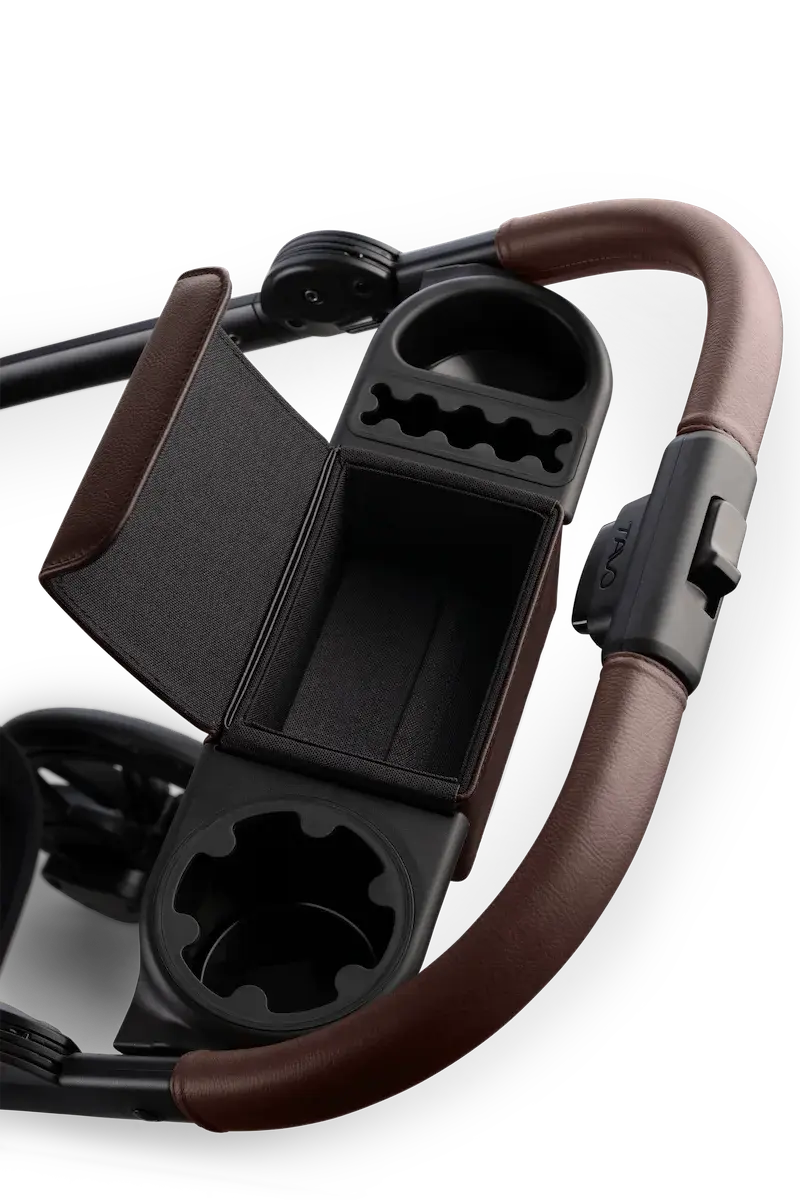 Wbudowany organizer na rączce do pchania obejmuje uchwyt na kubek, kieszeń na telefon i przegródkę z bezpiecznym zamknięciem magnetycznym, aby wszystko, od kluczy po smakołyki, było w zasięgu ręki podczas podróży.