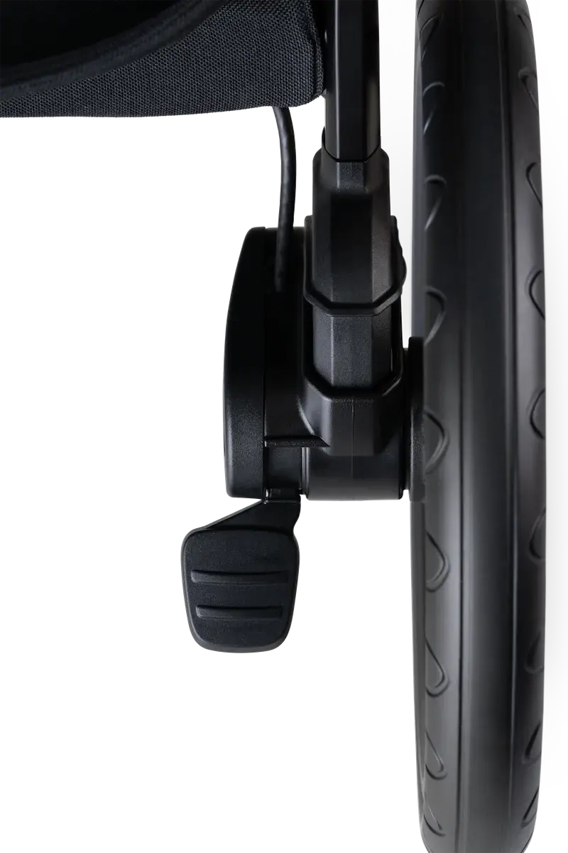 Transporter Maeve (sprzedawany oddzielnie) można bezpiecznie i łatwo zamontować na ramie wózka.